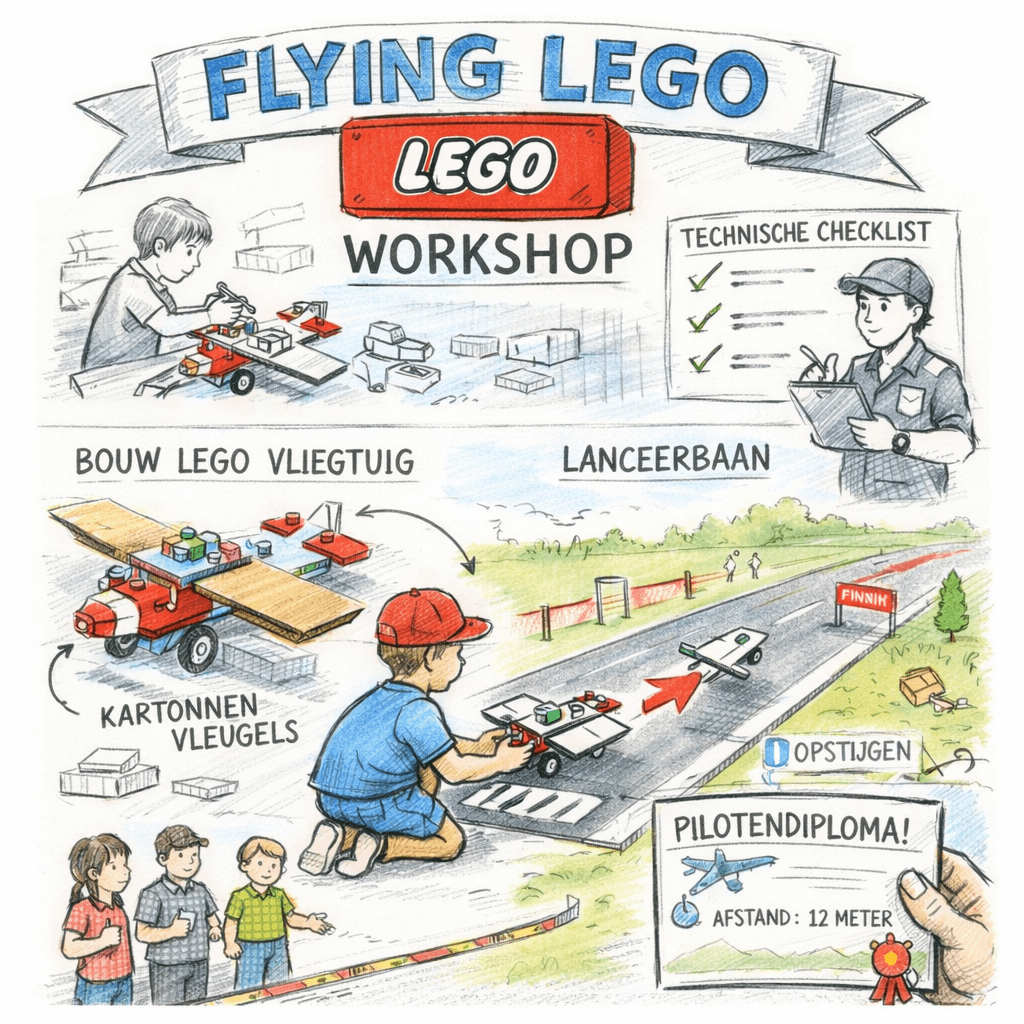 Tijdens de workshop Flying LEGO stappen deelnemers in de wereld van techniek, luchtvaart en creativiteit. Net als de gebroeders Wright bouwen zij hun eigen vliegtuig, maar dan met LEGO®. Stap voor stap ontstaat er een stevig frame, dat wordt uitgebreid met zelfgemaakte vleugels en slimme verstevigingen. Onderweg ontdekken de kinderen spelenderwijs waarom een vliegtuig kan vliegen: wat doet de romp, waarom zijn vleugels belangrijk en hoe zorg je voor stabiliteit in de lucht?